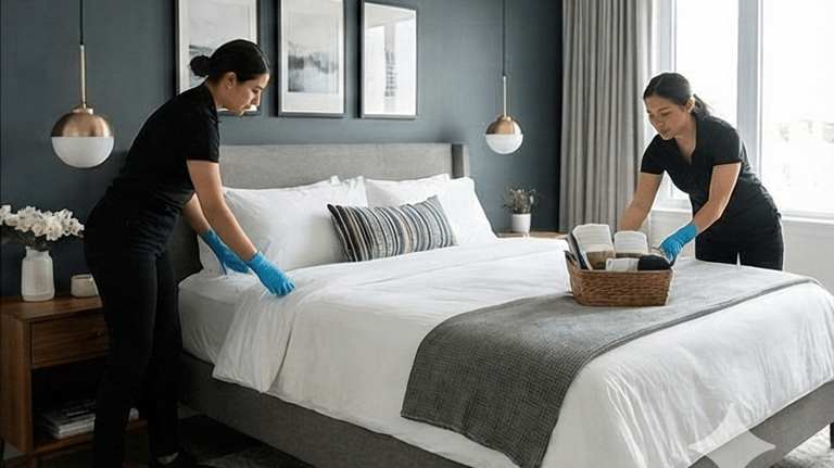 Hotel-style bed cleaning and organization, with neatly made beds for a polished, guest-ready look